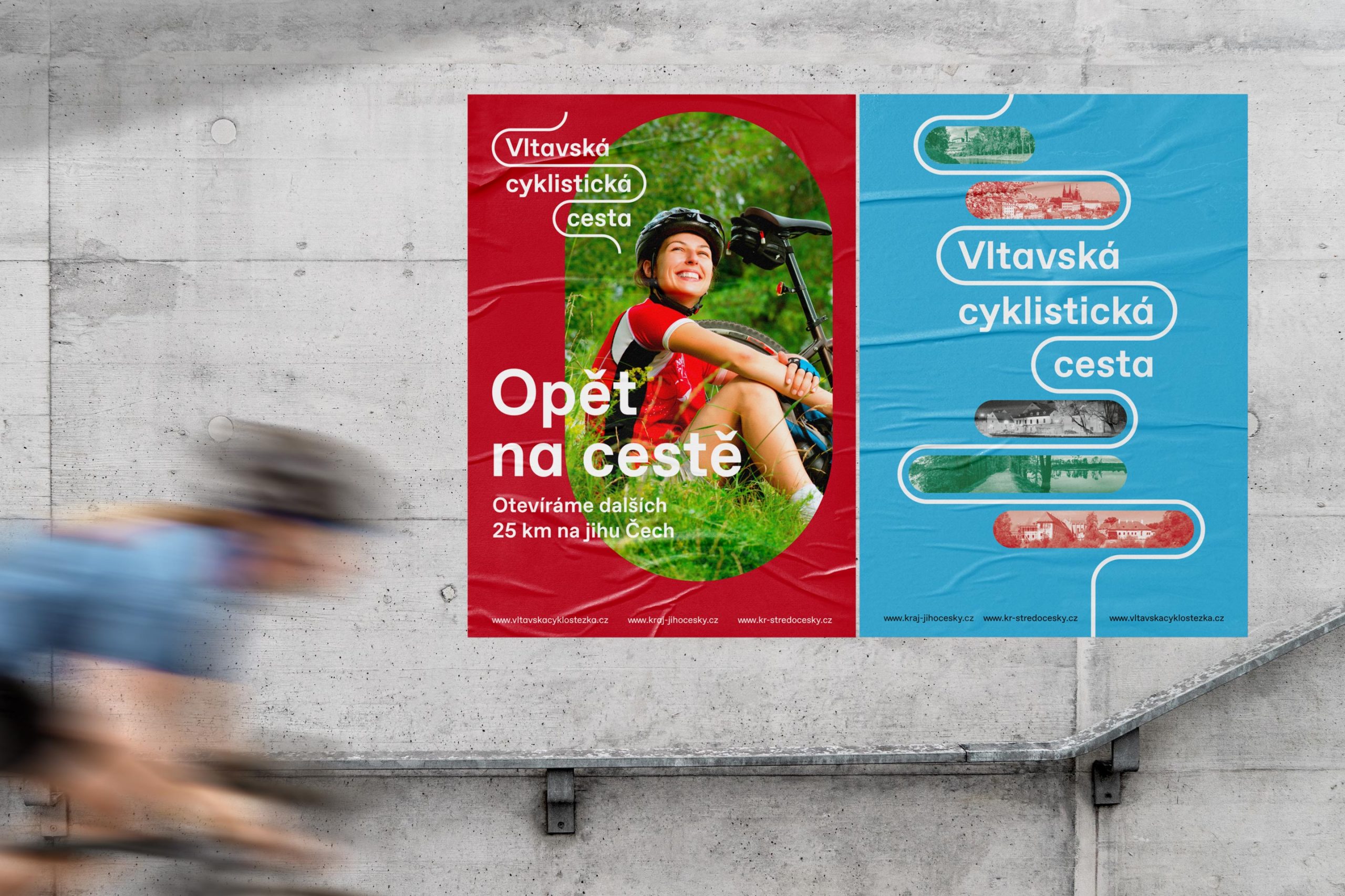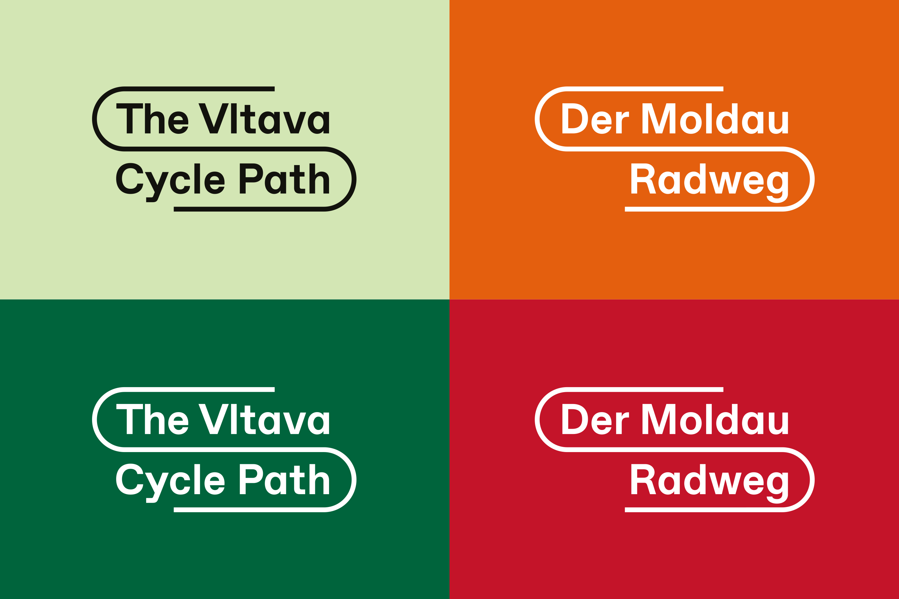 We created a graphic identity for the backbone Czech cycle route in the South Bohemian Region. The combination of text and the characteristic meanders of the Vltava River form the building blocks for an endless series of derived motifs. The system is ready for further language versions.